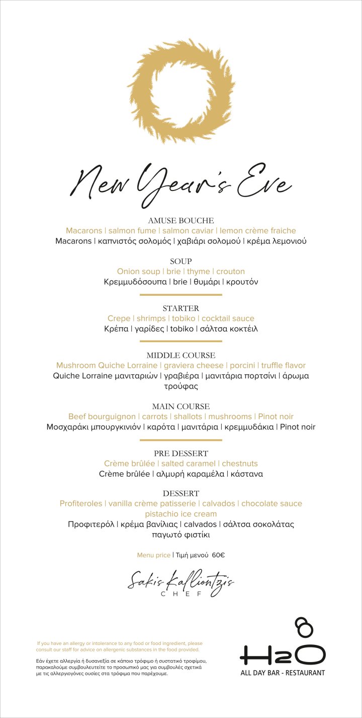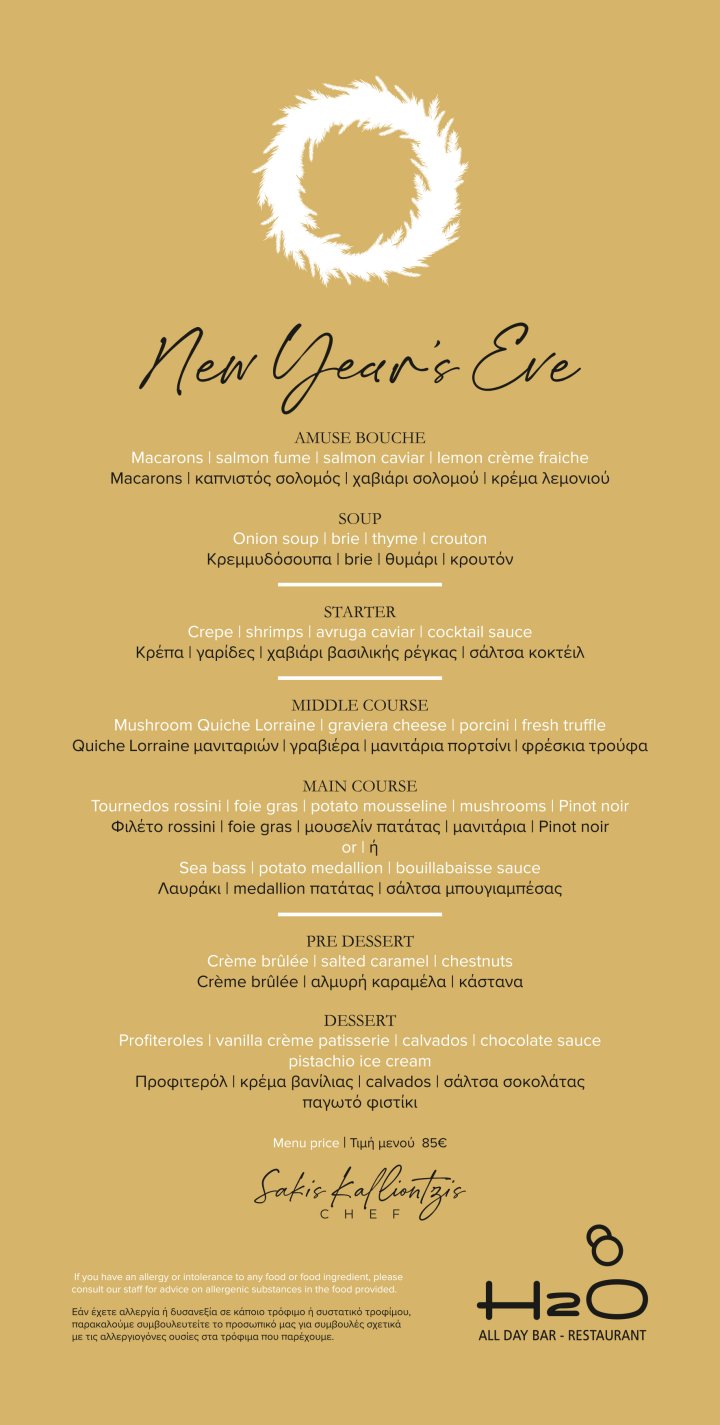 Celebrate the arrival of the New Year with a menu inspired by Greek tradition and flavors, carefully crafted by our Chef Sakis Kalliontzis. Let the unique tastes and festive atmosphere make this night truly unforgettable.